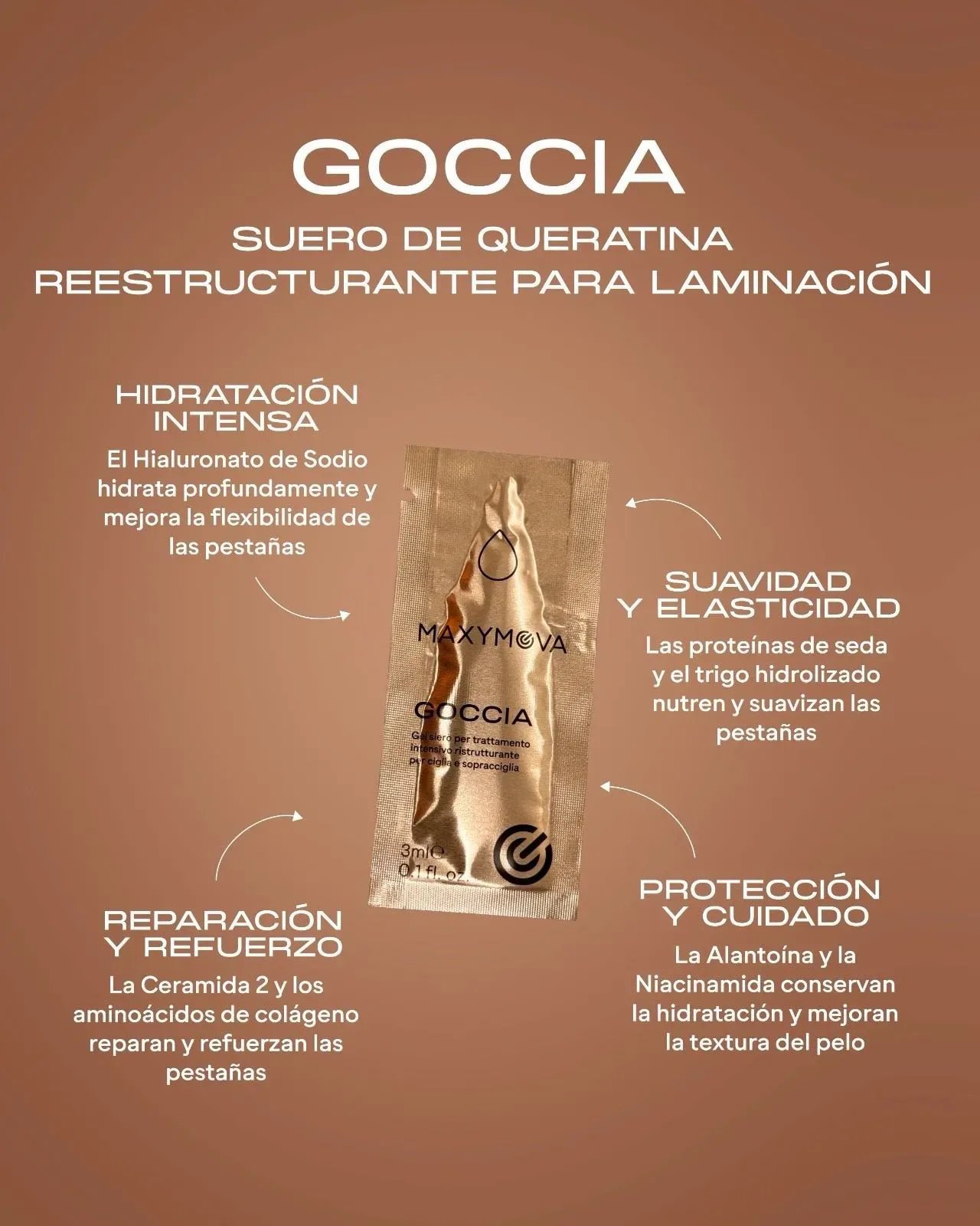 Goccia es un suero reestructurante que se utiliza durante el tratamiento de laminación para nutrir, hidratar y aumentar el brillo de las pestañas y las cejas.